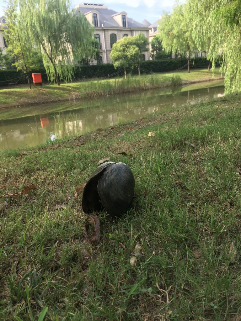 Eine Muschel – bestimmt 15 cm groß – und sie scheint aus dem Fluss zu kommen, der direkt an unserem Compound entlang fließt. Ich mag gar nicht wissen, wie die Fische aussehen, die die Männer hier rausziehen….