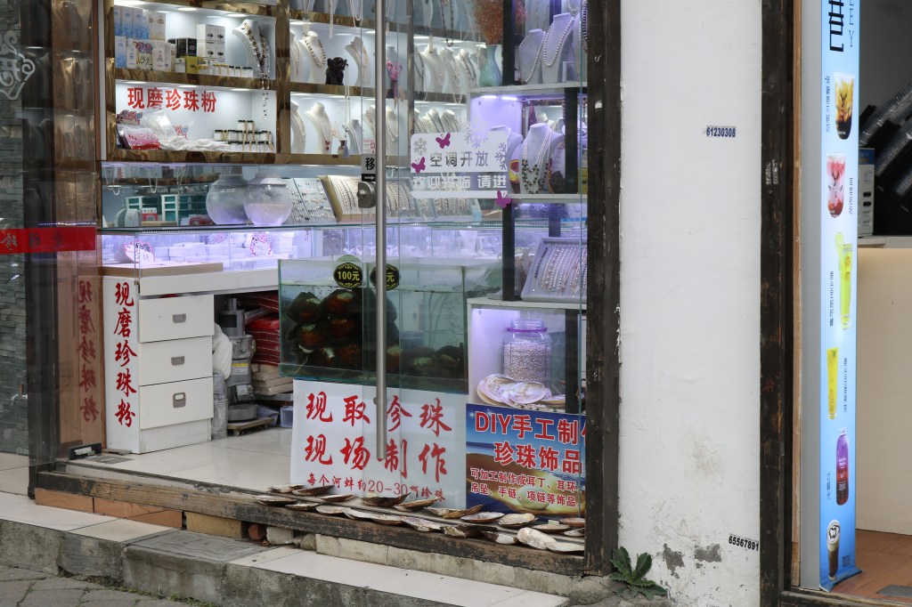 Für den ersten Einblick war es auch ganz nett. Eigentlich ist Suzhou für seine Seidenarbeit bekannt, aber auch Perlen. In der Altstadt gibt es daher zahlreiche Geschäfte, die Ketten verkaufen – und anscheinend kann man sich eine Perle selber „erjagen“, indem man eine Muschel aus dem Aquarium angelt, öffnet und die Perle verarbeitet wird.
