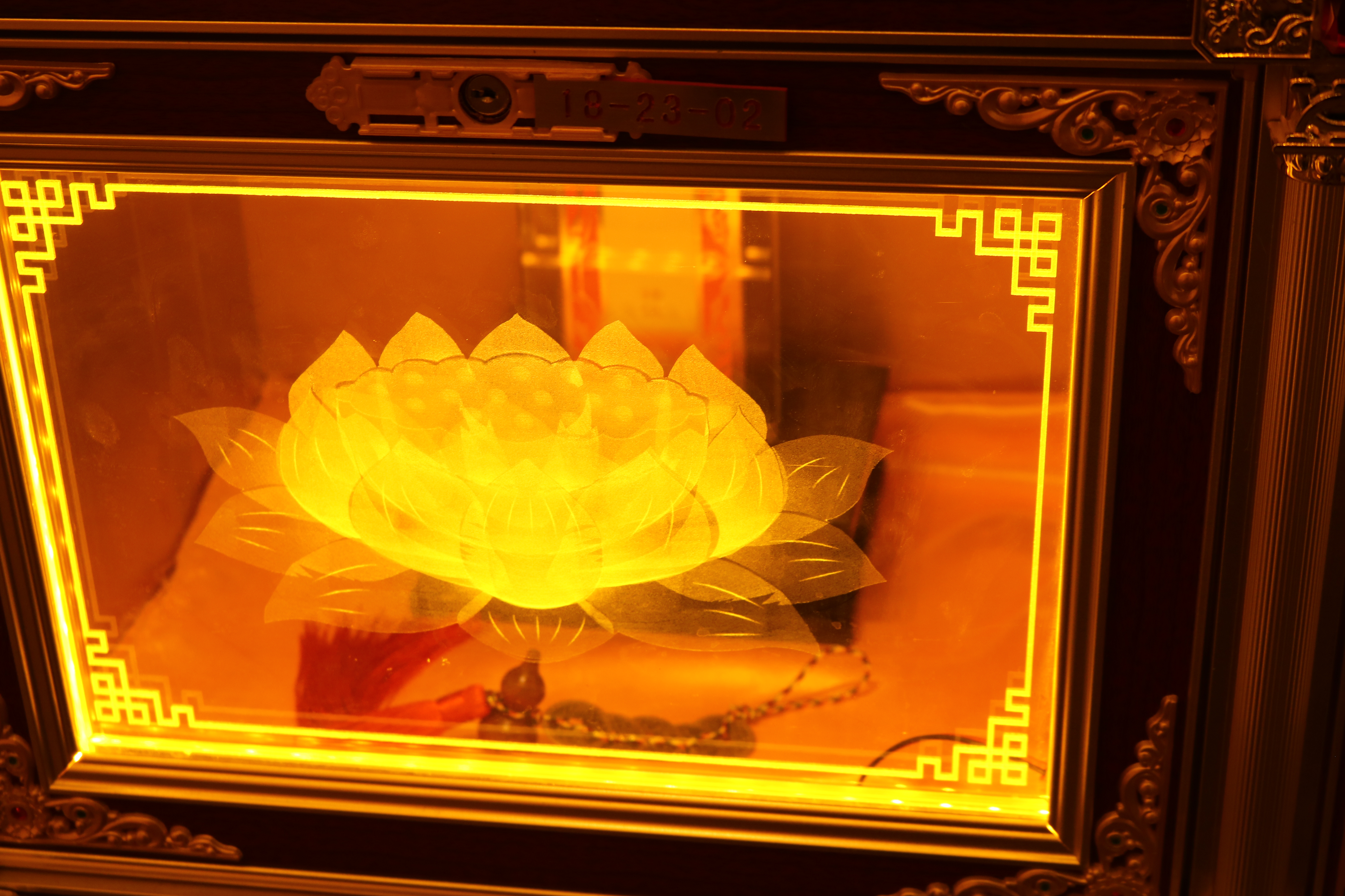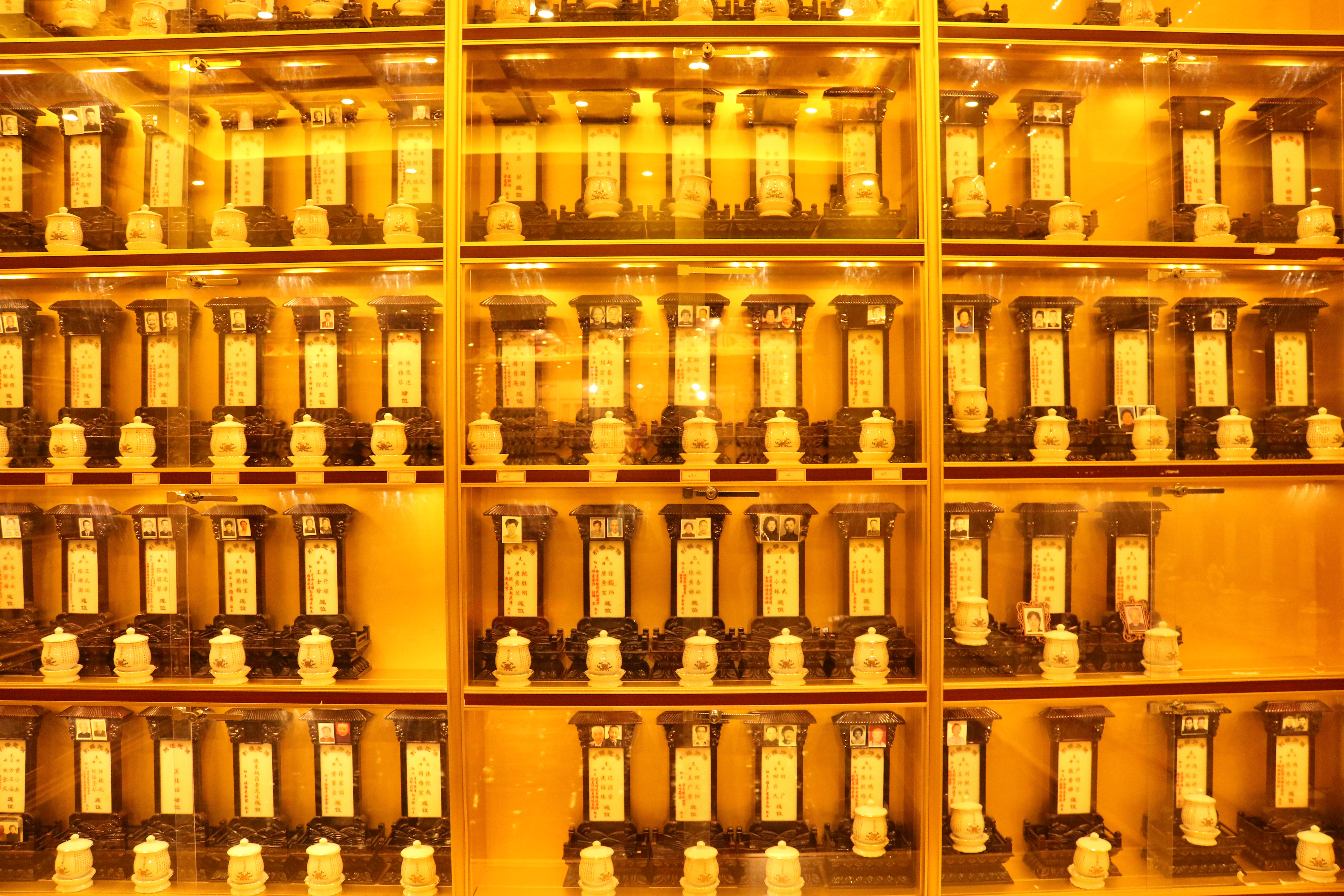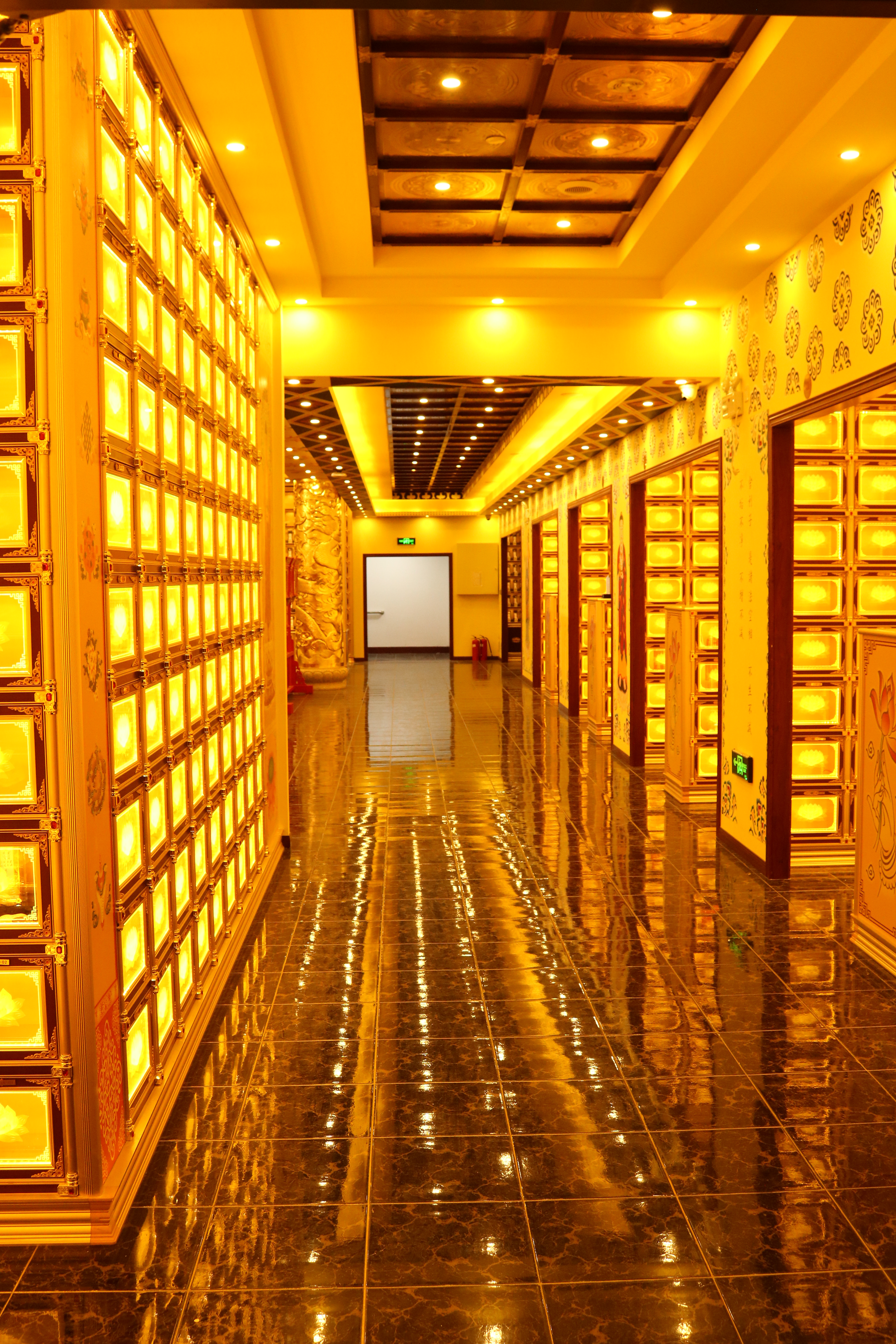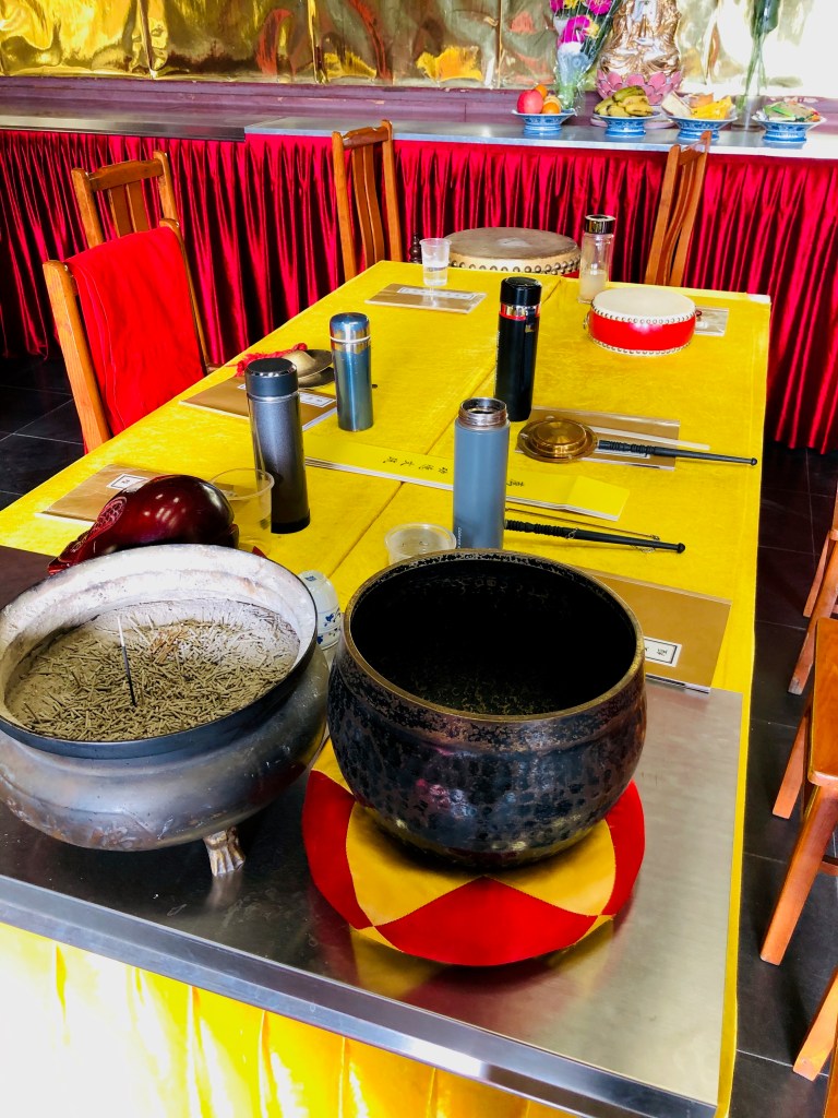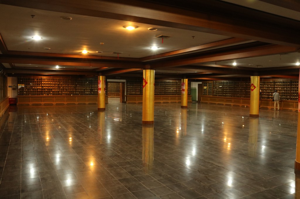 Leider habe ich noch nicht genau herausgefunden, was dieses Figuren zu bedeuten haben. Meine Chinesisch-Lehrerin meint, dass Leute, die viel spenden, quasi einen Platz hier bekommen und ihren Nahmen drauf schreiben können. Aber es sind soooo viele Figuren und dann unterschiedliche Kästchen. Und bei den Recherchen habe ich noch nichts dazu gefunden. Nach den schon sehr beeindruckenden Räumen folgten wir einem choralen Gesang und kamen in Räume, die fast blendeten. Es hatte etwas sehr Mystisches: