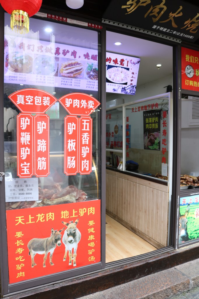 Nanxiang ist ein Ort, an den ich auf jeden Fall zurückkome! Denn es gibt noch sooooooo viele Geschäfte und Restaurants aus denen es duftet und die Waren schmackhaft aussahen. An den skurrilen Dingen kann man dann getrost vorbei gehen. Aber Esel-Wurst gibt es ja auch auf Sizilien…