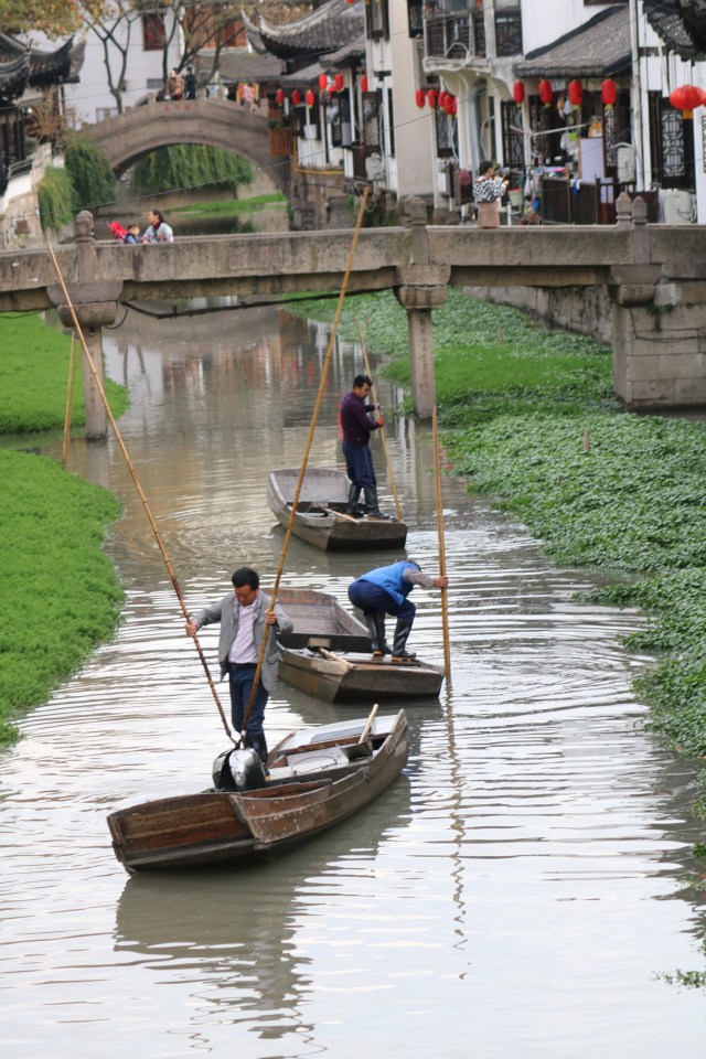 Auf dem Weg zu einem Café mussten wir noch einmal an der Wasserstadt vorbei. Unten schipperten ein paar Boote vorbei – sah erst einmal nicht ungewöhnlich aus, dann sahen wir, dass die Männer mit einer Art Riesenzange etwas vom Boden hochholten. Was sie da machen, konnte mir bisher noch keiner sagen… also: wieder ein Fall für die weitere Recherche….