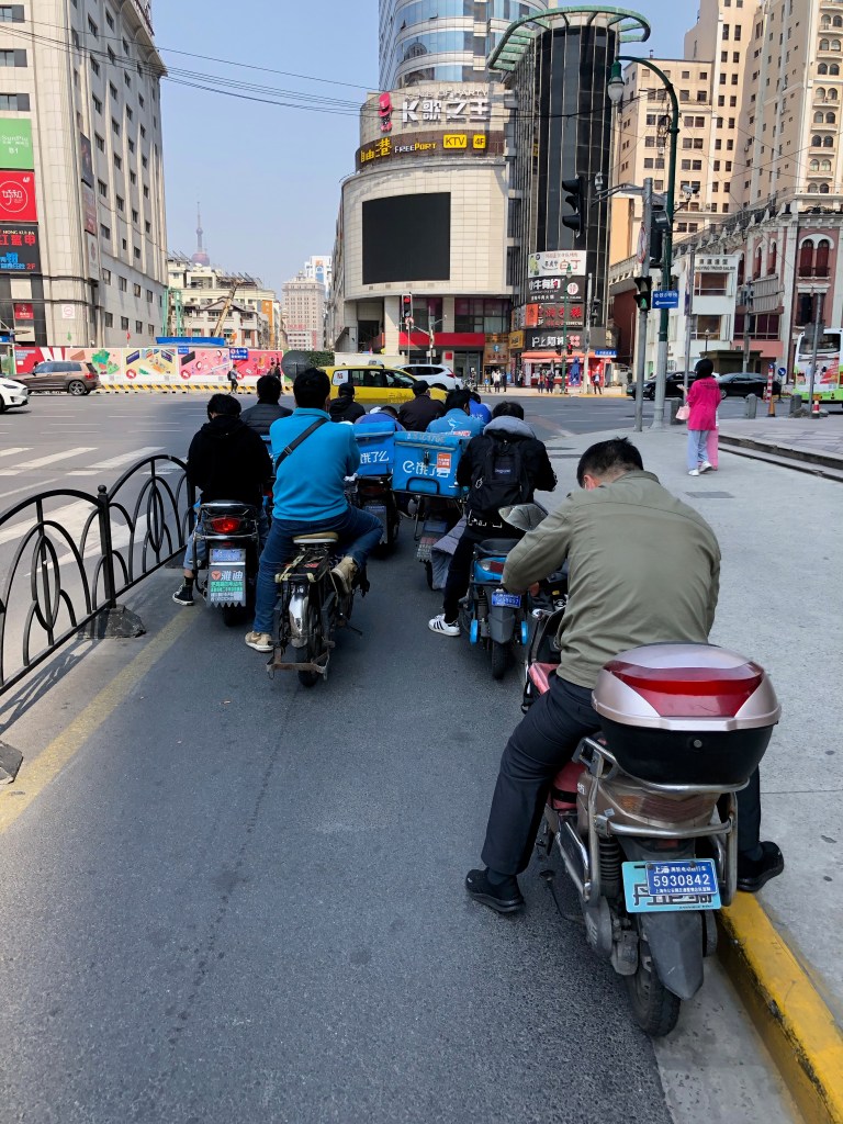 Wie alle schnell aufs Handy schauen (bei uns, weil wir den Weg nicht kannten – bei den anderen, um schnell den Film zuende zu schauen, die Videounterhaltung fortsetzen oder Wechat checken… ). Bis der E-Motor „aufheult“ wird die typische Handyhaltung eingenommen – die auch beim Fahren gerne weiter beibehalten wird. Das macht allerdings das Fahren etwas gefährlicher, da man oft nicht weiß, ob der Verkehrsteilnehmer abgelenkt ist.