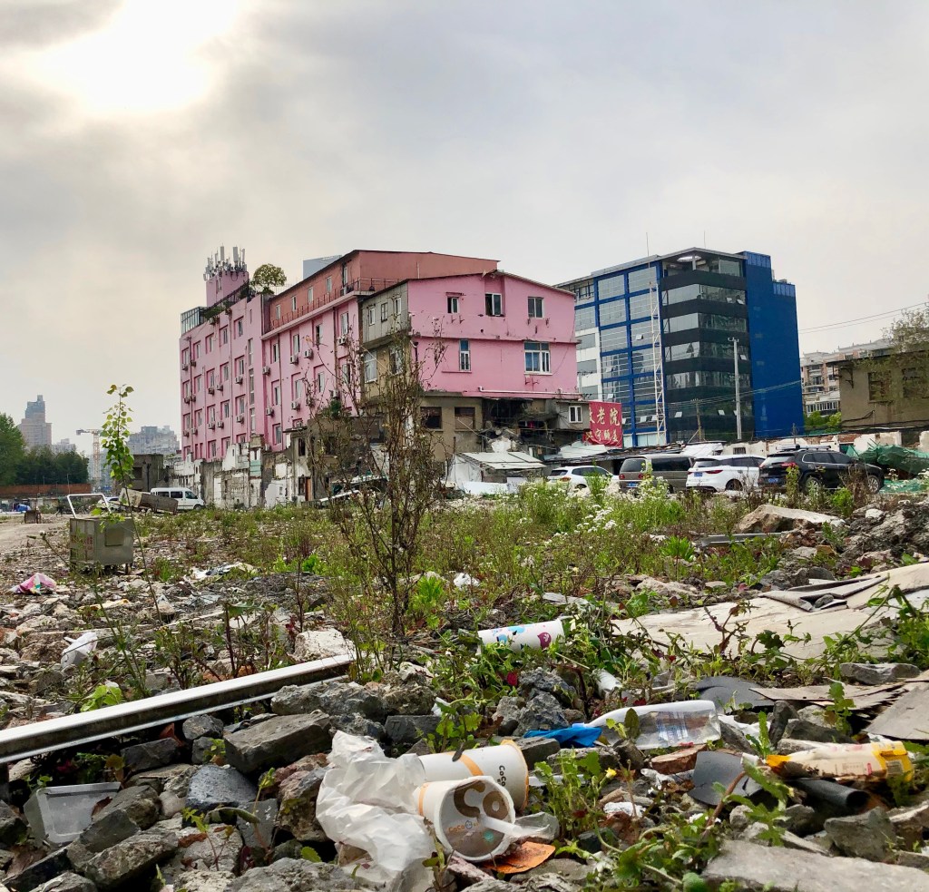 Es ist nicht selten, dass viele Häuser/ Viertel abgerissen, und die Flächen neu bebaut werden. Aber immer wieder widersetzen sich einzelne Häuser(Besitzer) dem ganzen und bleiben stoisch stehen.
