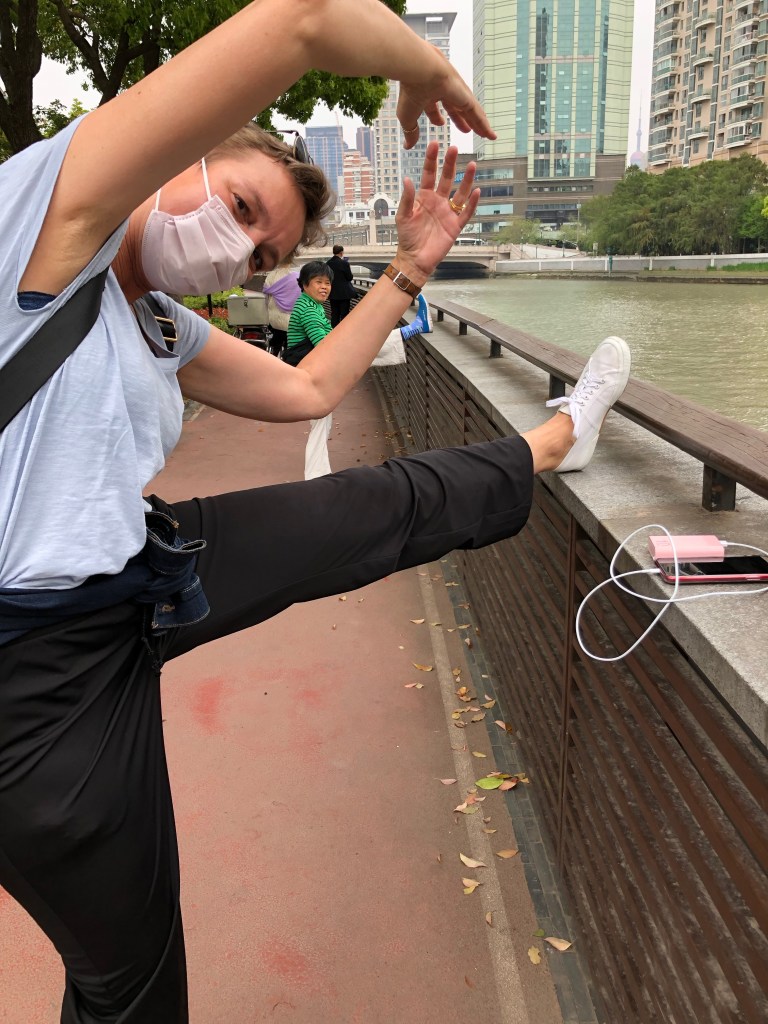 Unser nächstes Ziel war ein Museum, dessen Außenwände noch Spuren von den Japanischen Angriffen in den 1940ger Jahren zeigen. Leider kamen wir nicht ins Innere des Museums, da wir nicht nur unsren grünen Code vorweisen mussten, sondern den original Pass hätten dabei haben müssen. Dieser zeigt, wann wir in China eingereist sind. Da wir bei diesen nicht dabei hatten und alles Bitteln und Betteln nichts half, machten wir eine kleine Sport-Pause am Fluss. Hier trafen wir wieder auf eine nette Dame, die mächtig Spaß hatte, dass wir uns auch durch Gymnastik fit halten.