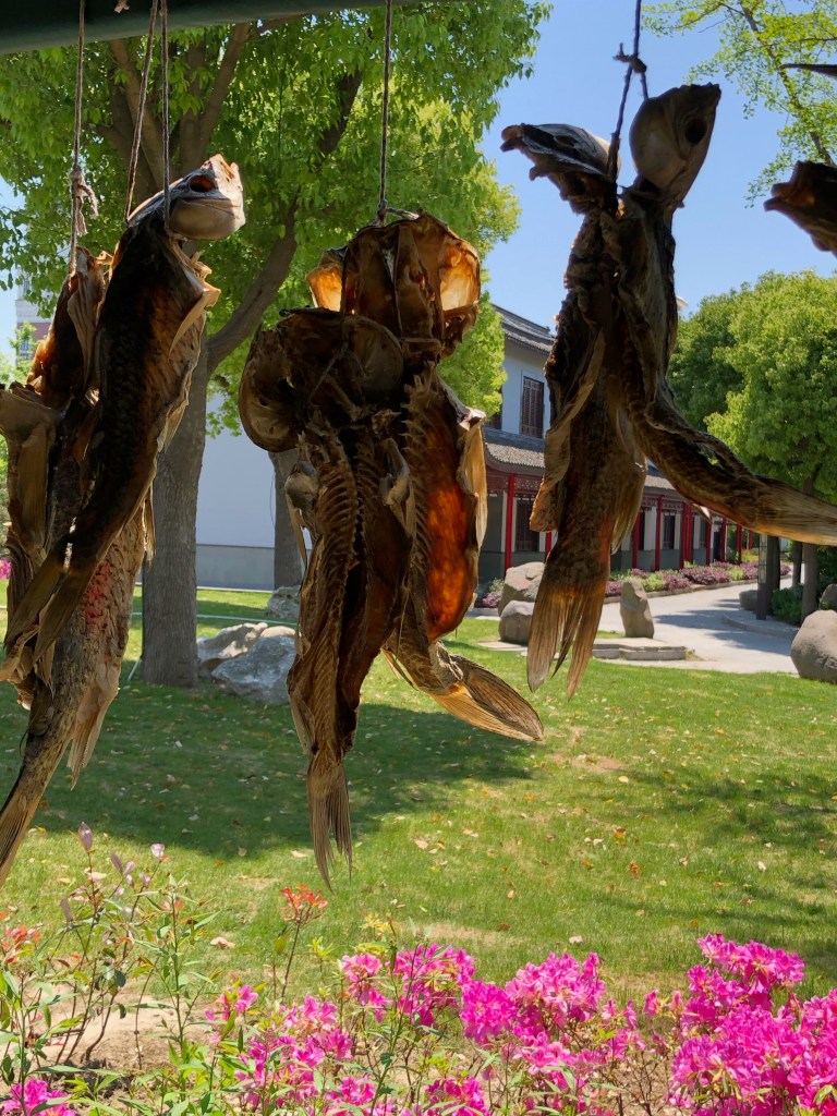 Eigentlich wollten wir in ein Künstlerdorf, das im Süden Shanghais liegt. Aber wegen des Virus ist es noch geschlossen. Das hielt uns aber nicht davon ab, durch den benachbarten Park zu strolchen und ein paar getrocknete Fische auf dem Mofa-Parkplatz für die Angestellten zu entdecken.