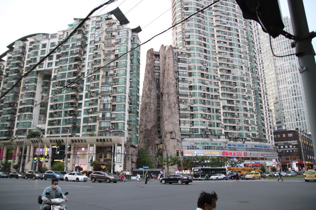 Erst auf den zweiten Blick nimmt man den Felsen im Hochhaus-Gewimmel wahr: Was macht dieser Fels mitten in der Stadt? Ist er echt? Gehört er zur Architektur? Hat er eine Funktion?