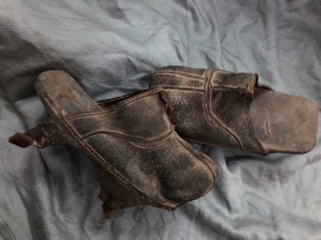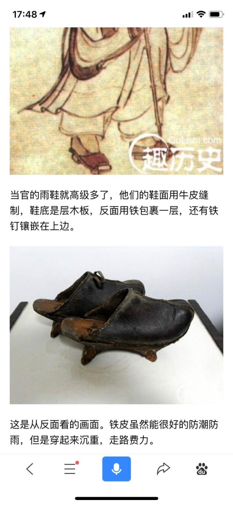 Siehe da, Schuhe, wie meine, stehen im Museum. Sie scheinen in der Tang Dynastie ( 617 bis 907, gilt in der historischen Forschung als ein Höhepunkt der Geschichte Chinas) Mode gewesen zu sein. Die Clogs sind anscheinend eine Art Regenschuhe, die die Reichen und Offiziellen (Politiker) getragen haben, um trockenen Fußes von A nach B zu kommen. Ich hätte eher gedacht, dass es Arbeiter oder Bauernschuhe seien. Aber Leder und Metall konnten sich anscheinend nur die Wohlhabenderen leisten…