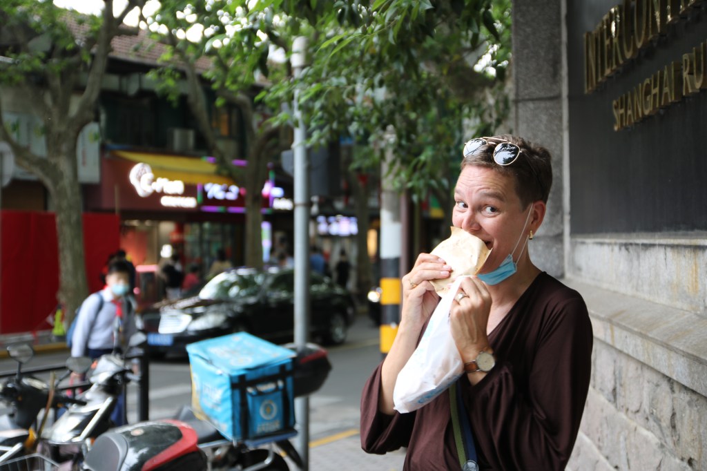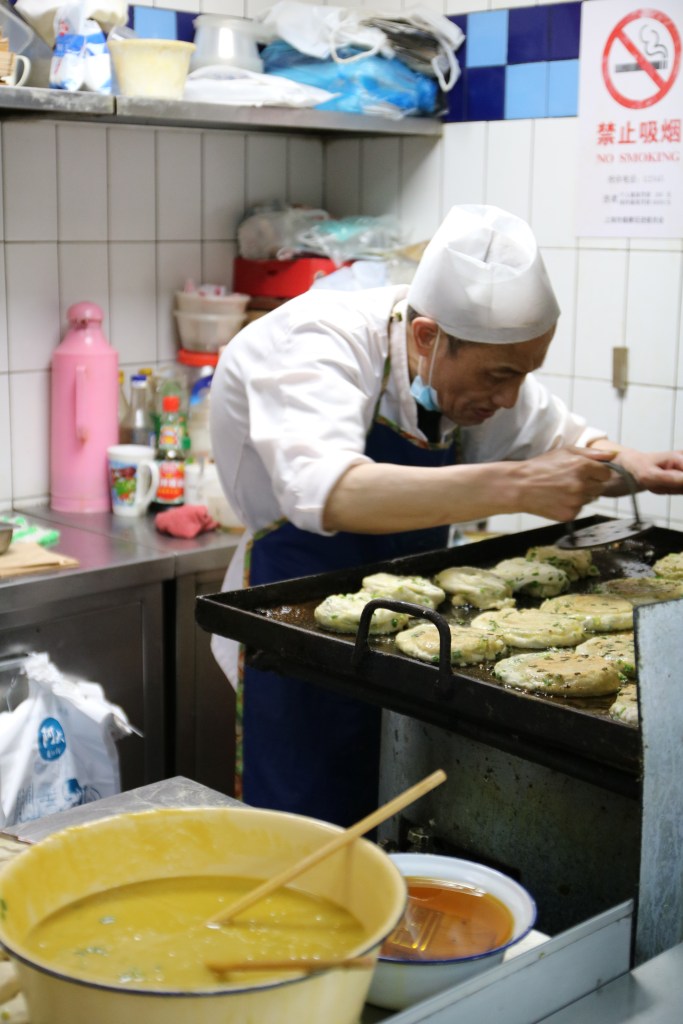 In der Stadt, in der nichts von Dauer ist, fasziniert ein Pfannkuchen, der drei Jahrzehnte lang gleich geblieben ist, besonders. Sei über 30 Jahren backt der bucklige Chinese täglich (außer Mittwochs, das ist sein Wochenende) seine Pfannkuchen nach Shanghai-Art – immer nach dem gleichen Rezept: gefüllt mit Frühlingszwiebeln, Schweinefleisch und einer Senfsauce – gebraten und gegrillt, bis sie knusprig und braun sind.