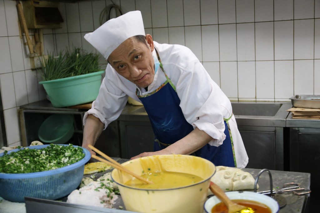 Um sechs Uhr morgens schreibt er Nummern auf die Hände der ersten Kunden, anschließend setzt er den Teig an, schneidet Frühlingszwiebeln und mischt die Sauce. Derweil warten die Menschen geduldig auf den Hockern auf dem Bürgersteig. Erst um 10 Uhr beginnt der Verkauf.