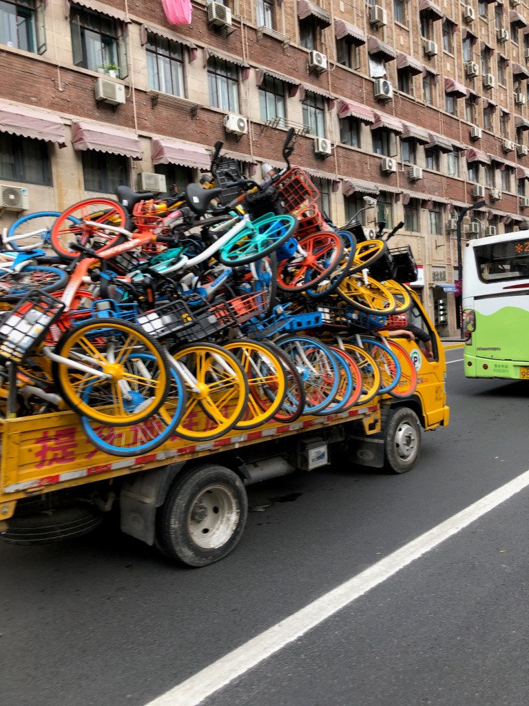 In Shanghai kann man an jeder Ecke Fahrräder ausleihen, wenn man die App hat und dementsprechend bezahlt. Es ist nicht teuer und so nutzen viele Shanghainesen dieses Angebot. Viele stellen die Drahtesel aber nicht an den vorgesehenen Stellen wieder ab, und so werden sie regelmäßig im Gebiet eingesammelt und an ihren Platz wieder gebracht.