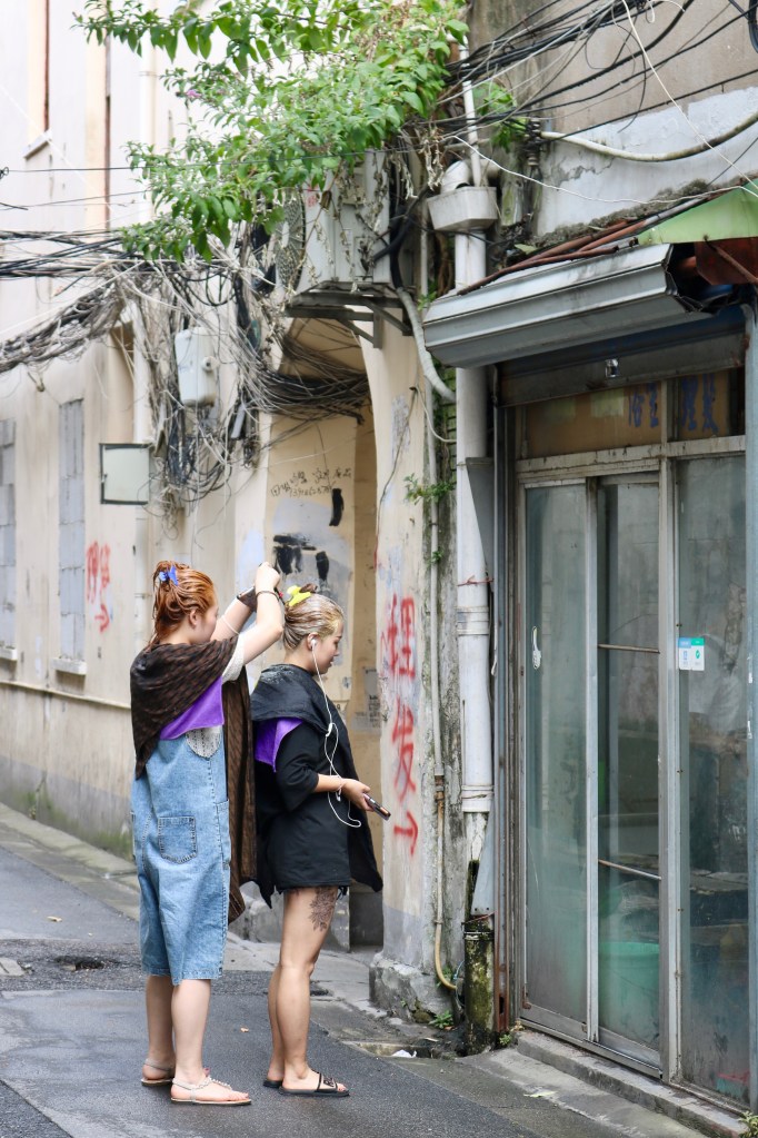 Ich habe das Gefühl, in einer Filmkulisse zu sein. Und gerade deshalb kommen die beiden jungen Damen, die sich vor dem Friseurladen die Haare machen, surreal vor.