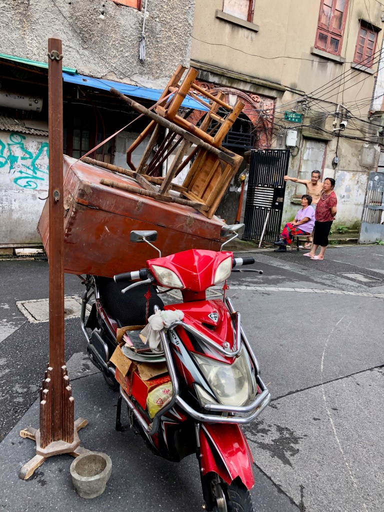 Ein Mofafahrer zieht seine Kreise durch die Gassen und sammelt Dinge auf, die entweder Bewohner vor die Tür gestellt haben oder ihm verkaufen.