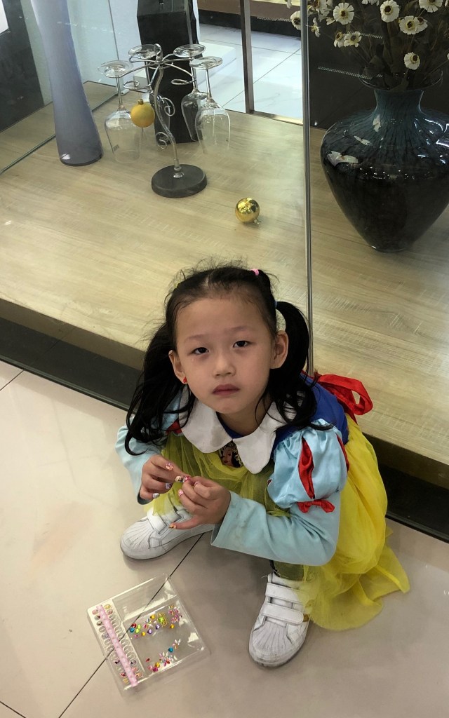 Über 100.000 Arten von Waren (internationaler und nationaler Marken) werden hier angeboten. Ich war fast zwei Stunden in dem Areal, völlig erschöpft und habe bei Weitem noch nicht alles gesehen, dafür aber wieder nette menschliche Motive eingefangen, wie diese junge Lady, die sich gerade die Fingernägel macht.