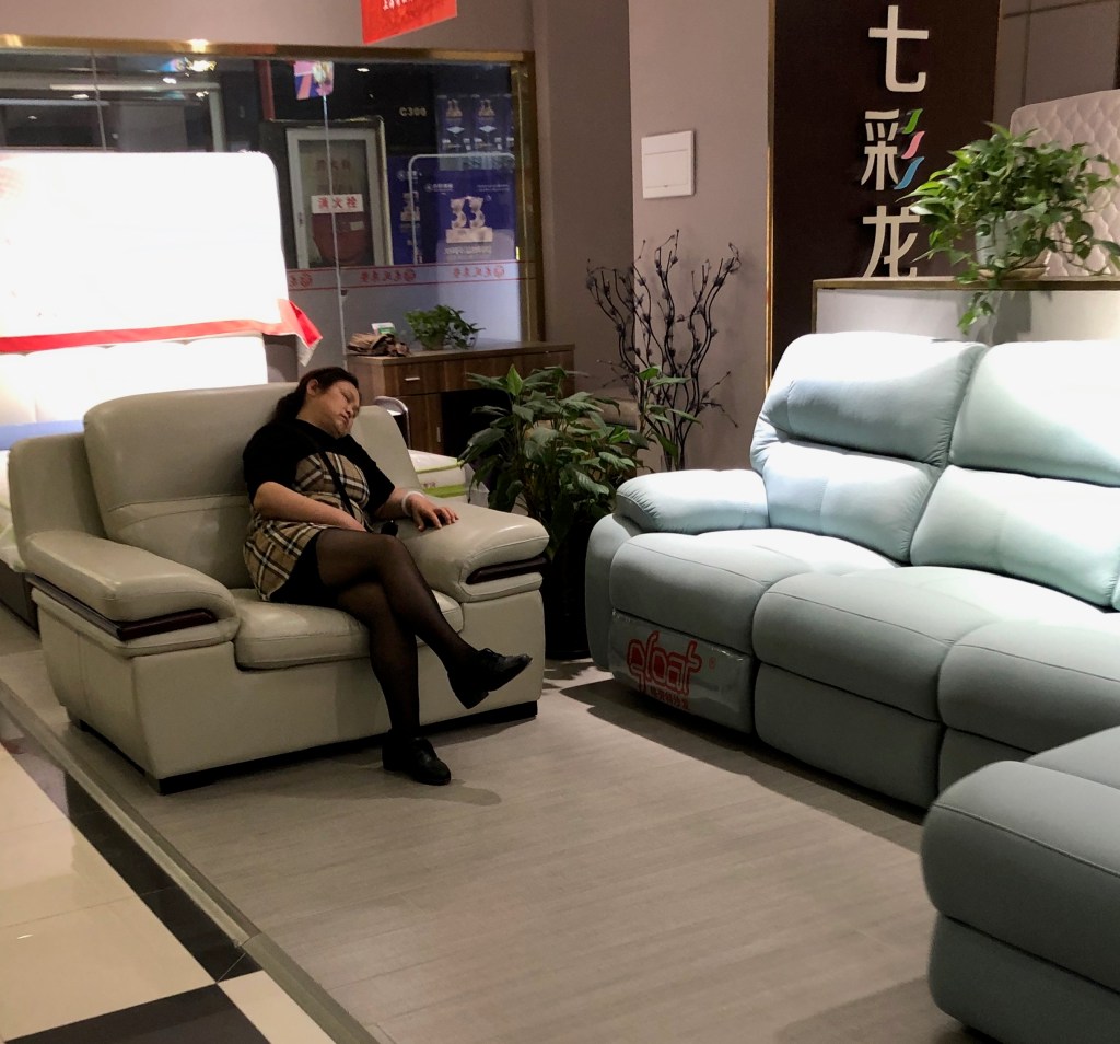 Oder diese Dame, die anscheinend für ihre bequemen Möbel wortlos Werbung macht.