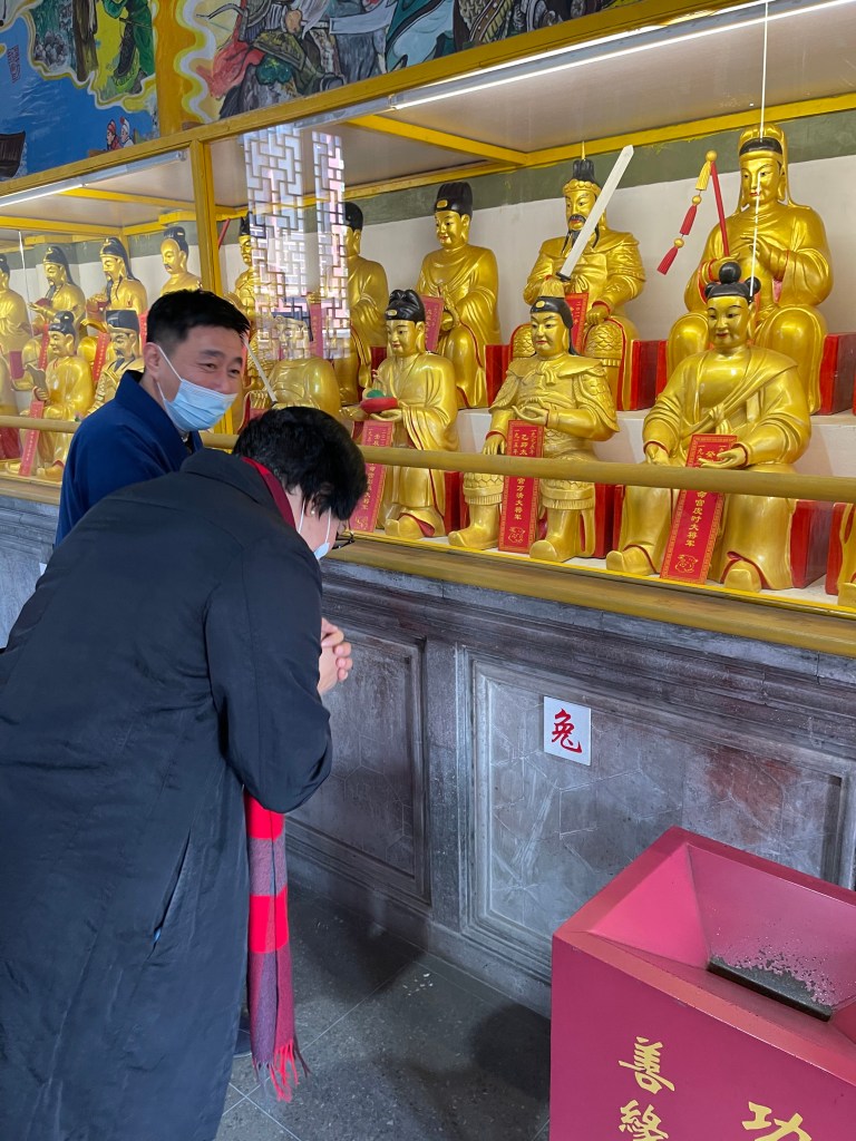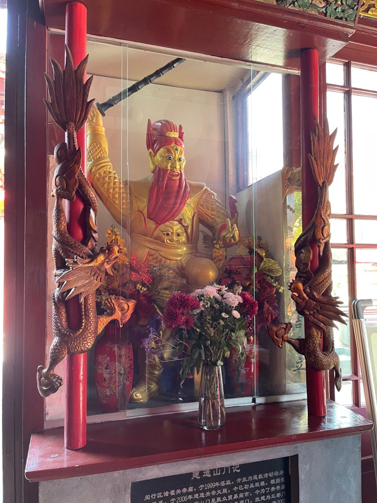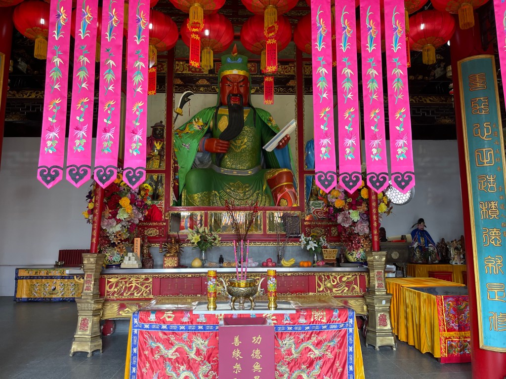Hier huldigen die Gläubigen Guan Yu, ein General der Han-Dynastie. Um ihn herum 12 Wächter, Gelehrte und Generäle, die die 12 Tierkreiszeichen verkörpern, zu denen man dann im Bedarfsfall beten und sie um Rat fragen kann.