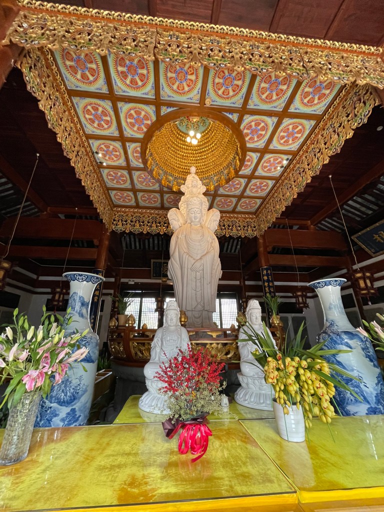 So hatten sie ihr Ruhe und ich musste mir in der Halle der perfekten Durchdringung die gut 5 Meter hohe und 35 Tonnen schwere vierseitige Marmor-Statue Bodhisattava, umgeben von 16 großen Holzsäulen, anschauen. Irgendwo soll ein 800 Jahre alter Gino-Baum stehen und in der unterirdischen Pagode liegen Reliquien des Buddhas. Die habe ich noch nicht entdeckt – kein Wunder, Nicole ist ja auch nicht mehr bei meinen Entdeckungen dabei.
