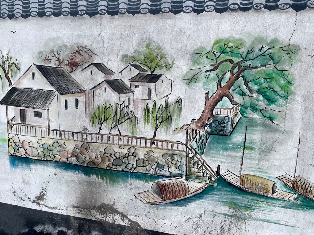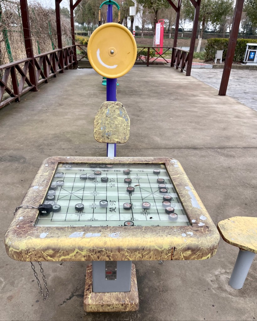 Da wir nicht verreisen können, entdecken wir eben unsere Nachbarschaft. Wir wohnen am westlichen Rande der Stadt „auf dem Land“, wenn man einen Shanghainesen fragt. Und in der Tat ist es wenige Minuten von uns schon recht ländlich. Viele Häuser haben nette Gemälde auf ihren Hauswänden und überall sieht man quasi Schrebergärten. Manche wohl organisiert, andere „irgendwo“ platziert. Und jedes Viertel oder Dörfchen hat seinen Trimm-Dich -Platz – wie hier – manche sogar mit Spieltischen. Hier werden die Spielesteine vom chinesischen Schach mit einem Magneten verschoben.