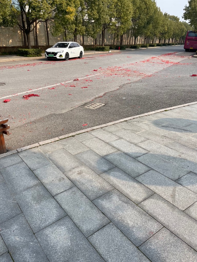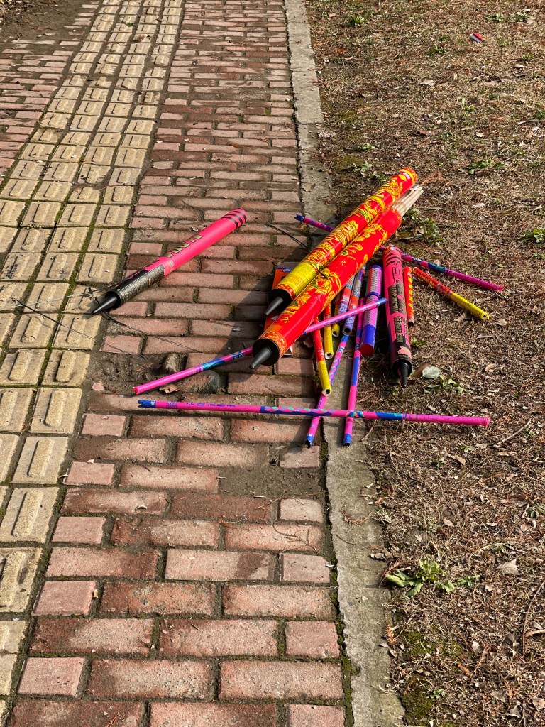 Auch, wenn das Chinese New Year erst am 15. Tag mit dem Laternenfest endet, wird in der Nacht zum 5. Tag ordentlich Krach gemacht -gerne mit Böllern und Feuerwerk. In der Stadt ist es verboten, aber auf dem Land darf noch gezündet werden. Und davon wird in der ganzen Nacht auch Gebrauch gemacht. Denn der Wohlstands-Gott kommt am 5. Tag und da wollen alle sicher gehen, dass er auch wirklich den Weg ins Haus findet. Zumindest zum Eingang unseres Compounds sollte er sein Weg mal sicher gewesen sein, wenn man die Reste des Böllerns am nächsten Tag betrachtet 😉