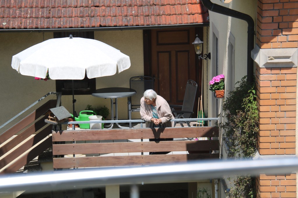 Hier scheint noch die Welt in Ordnung. Die Dame gegenüber sitzt – wie all die letzten Jahre – vor ihrem Haus und unterhält sich mit den vorbeigehenden Nachbarn.