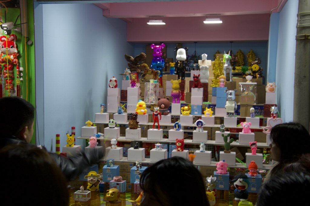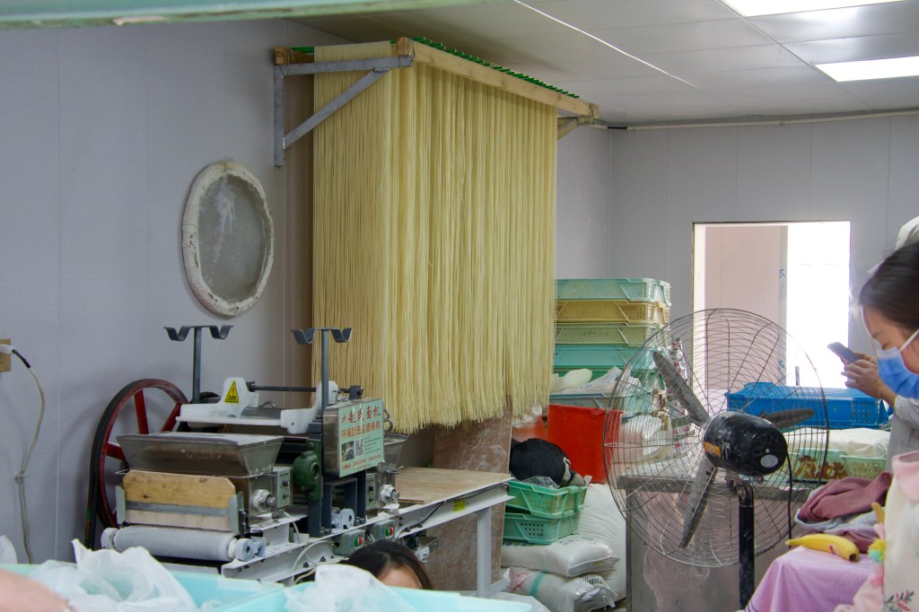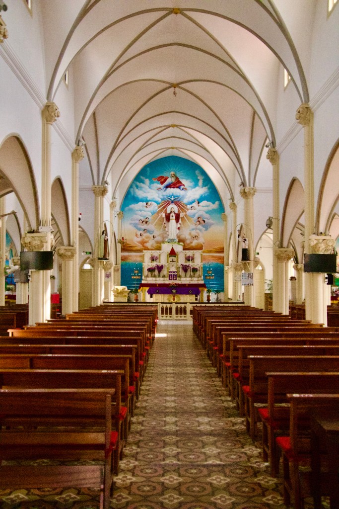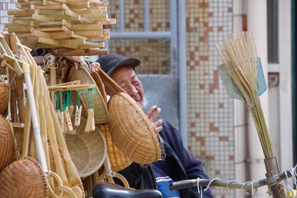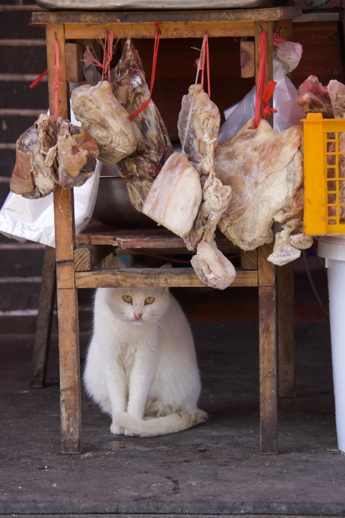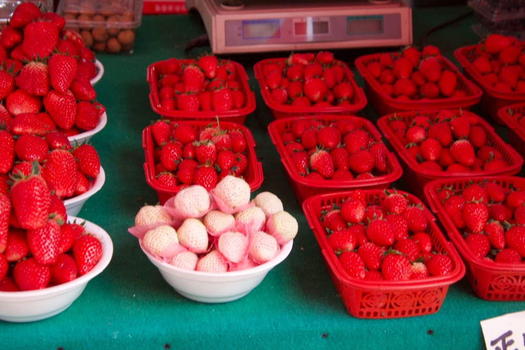 Direkt im Anschluss an die Kirche gibt es eine Markt-Straße, in der man – wie gewohnt – alles bekommt. Hier werden die Hühner überwiegend lebend und am Stück abgewogen. Frösche, Fische, Schildkröten tummeln sich in den Bottichen, alte Menschen plaudern und Kinder kaufen um sie herum. Nudeln hängen zum Trocknen und die weißen Erdbeeren (schmecken genau so wie die roten) sehen verlockend aus. Wer genau hin schaut sieht, dass der Besitzer im Gemischtwarenladen sein Bett dort auch hat (da er dort auch wohnt) und in diesem auch auf Kundschaft wartet.
