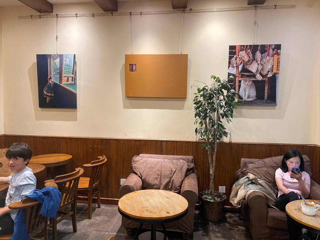 Wenn ich die Veränderungen sehe, bin ich um so glücklicher, dass ich so Vieles fotographisch eingefangen habe. Und nun auf der letzten Strecke werden sogar einige meiner Bilder ausgestellt – unter anderm im lokalen Café Du Village, wo „Alles“ begann (hier geht es zurück in die Vergangenheit und dem Bericht im August 2019). Hier hatte ich mein erstes Frühstück in Huacao, wie der Stadtteil heißt, in dem wir leben.