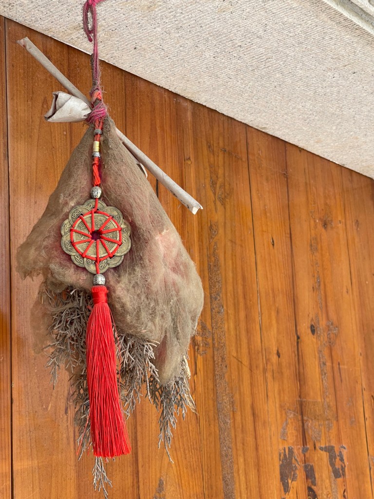 Nach rund 10 Kilometern Marsch brauchten wir ein Pause und wurden am Seeufer fündig. Durch kleinere Gässchen, vorbei an Teebauern und Häusern, deren Türen mit seltsamen Dingen dekoriert sind, kamen wir zu einem Restaurant mit Jachthaften. Immer einen Überraschung hinter der nächsten Kurve.